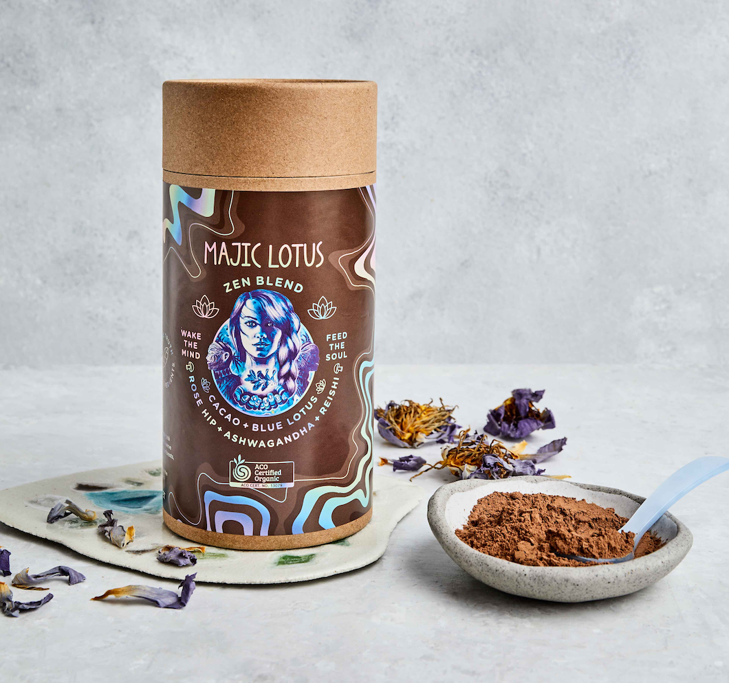 Our Zen Latté blends medicinal mushrooms, cacao, blue lotus, ashwagandha, rosehip, warming spices, and coconut sugar. Grounding, delicious, and 100% natural